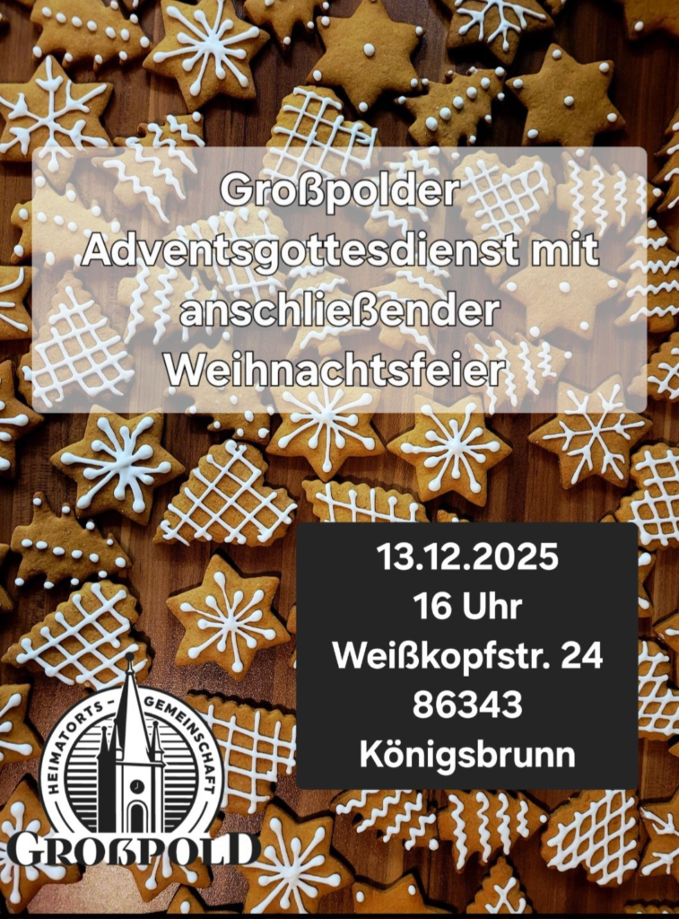 Einladung zum Adventsgottesdienst mit anschließender Weihnachtsfeier Zum Abschluss des Jahres gestaltet der Verein Heimatortsgemeinschaft Großpold e.V. einen Adventsgottesdienst mit dem traditionellen „Großpolder Leuchtersingen“ und anschließender Weihnachtsfeier. Herzliche Einladung an alle Großpolderinnen und Großpolder, sowie an alle Interessierten für den 13. Dezember 2025 um 16 Uhr nach Königsbrunn bei Augsburg in die Evangelische Gemeinschaft Königsbrunn, Weißkopfstr. 24, 86343 Königsbrunn. Erfrischungsgetränke, Glühwein, Punsch und Kaffee werden zur Verfügung gestellt. Wir freuen uns über mitgebrachten Kuchen und Speisen zur Stärkung und einen schönen Nachmittag und Abend in geselliger Runde. Besonders freuen wir uns über alle Kinder, die an diesem Tag etwas vortragen möchten. Für sie haben wir traditionell eine kleine Überraschung vorbereitet.